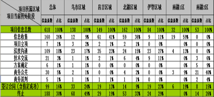 處于信息收集階段的有160條,占信息總數(shù)的26%;處于立項階段的有7條,占1%;處于深度溝通階段的有109條,占18%;處于技術交流階段的有21條,占3%;處于方案確定階段的有6條,占1%;處于商務攻關階段的有30條,占5%;處于商務談判階段的有5條,占1%;已簽訂型材合同(含指定成功)的有99條,占16%;因定競品及替代材料品而形成終止的有188條,占30%。