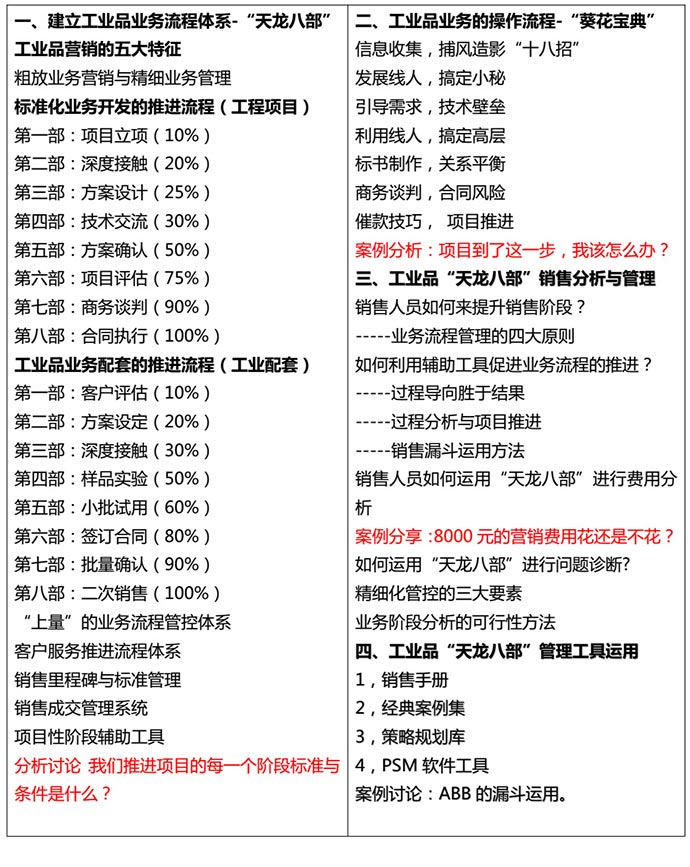 工業(yè)品業(yè)務(wù)流程管理與七步分析法 | 1天 | 2500元/人 | 7月10-12號 | 8月21-23號 | 10月23-25號 | |||||
