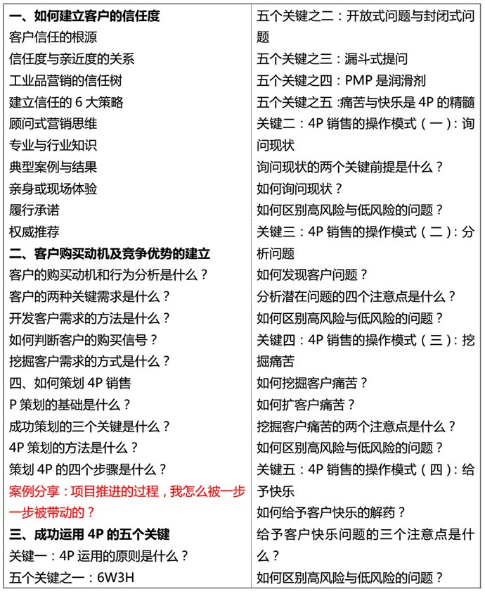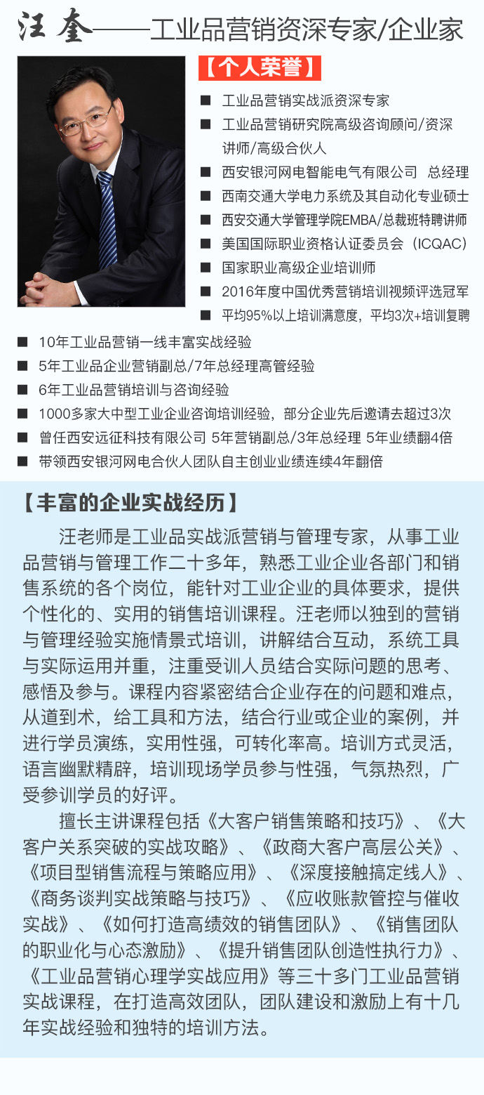 訓(xùn)練前:帶著實際工業(yè)品營銷問題和疑難案例來學(xué)習(xí),設(shè)定本次5天完整系統(tǒng)學(xué)習(xí)后期望提升的目標(biāo); 訓(xùn)練中: 1、課堂講授科學(xué)化系統(tǒng)化標(biāo)準(zhǔn)工業(yè)品業(yè)務(wù)流程系統(tǒng); 2、資深工業(yè)品營銷講師手把手輔導(dǎo)業(yè)務(wù)流程天龍八部每個步驟工具分析法 3、根據(jù)業(yè)務(wù)流程步驟提供大量可落地,可實際運用的營銷策略方法及工具 4、經(jīng)典工業(yè)品營銷案例解析,小組演練,提供疑難案例的方法論,讓銷售實際運用有章可循。 訓(xùn)練后:完成系統(tǒng)化工業(yè)品營銷流程,完成學(xué)習(xí)任務(wù)清單,后期通過微信群持續(xù)免費提供各種工業(yè)品營銷知識,有問題可免費找導(dǎo)師咨詢,也可持續(xù)進(jìn)行線上工業(yè)品營銷學(xué)習(xí) |