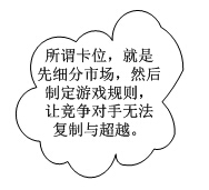 卡位的關(guān)鍵在于精確地判斷有效落點,并搶先對手占據(jù)有利位置。 卡位就是創(chuàng)造市場的第一選擇,讓競爭對手無法短時間來模仿; 卡位就是成為市場的第一選擇,從局部第一成為市場第一; 卡位就是市場再細(xì)分,選擇或者創(chuàng)造新市場; 沒有市場或者市場狹小,卡位可以創(chuàng)造市場; 卡位就是集中資源,來重新選擇適合的市場; 卡位就是定位的重新定位,目標(biāo)市場的新選擇; 卡位就是做小魚塘里的大魚,而不做大魚塘里的小魚。 卡位的目標(biāo)就是占領(lǐng)該細(xì)分市場,在一定時期內(nèi)最大限度的阻止其他企業(yè)進(jìn)入該細(xì)分市場,同時有效的經(jīng)營該細(xì)分市場,成為該細(xì)分市場的代表者和領(lǐng)軍者。 卡位的重點 卡位的重點,并不僅僅是發(fā)現(xiàn)了企業(yè)的競爭優(yōu)勢,發(fā)現(xiàn)了企業(yè)的賣點,發(fā)現(xiàn)了企業(yè)的薪資模式。最主要的目的是,如何來細(xì)分市場,找到自己清晰的定位,然后形成一個技術(shù)壁壘,屏蔽競爭對手,讓競爭對手短時間內(nèi)無法超越,這才是卡位的精神所在。 所以,卡位的兩大重點是:找到企業(yè)的細(xì)分市場,并塑造技術(shù)壁壘,這是非常重要的過程。 這里的技術(shù)壁壘不是指技術(shù)方面的,而是指通過某種手段達(dá)到所想要的競爭優(yōu)勢,形成堅實的壁壘來阻隔對手。 卡位的三個步驟 第一步,企業(yè)必須根據(jù)自身優(yōu)勢尋找到一個細(xì)分市場。這個細(xì)分市場別人沒有進(jìn)入的或者不成熟的。只有這樣,企業(yè)在進(jìn)入的時候,才能有效的利用和整合自身優(yōu)勢資源,并最大限度的在其他企業(yè)進(jìn)去此細(xì)分市場前設(shè)立商業(yè)門檻,從而達(dá)到阻止和干擾對手瓜分細(xì)分市場利益的目的。 第二步,這個企業(yè)要做到有效的卡位,必須有自己的資源優(yōu)勢。這些優(yōu)勢主要指技術(shù)優(yōu)勢、資金優(yōu)勢、市場優(yōu)勢,也可以包括渠道優(yōu)勢、品牌優(yōu)勢等。 第三步,選擇出最有優(yōu)勢方面的作為切入點。對于企業(yè)而言,選擇何種卡位方式尤為重要,可以技術(shù)卡位,可以形象卡位,可以品牌卡位,可以功能卡位。 【本文擴(kuò)展】 定位的起源 定位,是由著名的美國營銷專家阿爾·里斯與杰克·特勞特于20世紀(jì)70年代早期提出來的,當(dāng)時,他們在美國《廣告時代》發(fā)表了名為《定位時代》系列文章。 1996年,杰克·特勞特整理了25年來的工作經(jīng)驗,寫出了《新定位》一書。