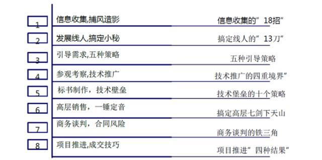 工業(yè)品營銷業(yè)務管控體系分為信息收集,項目立項,深度接觸,技術交流,方案確認,商務公關,