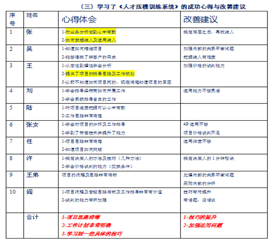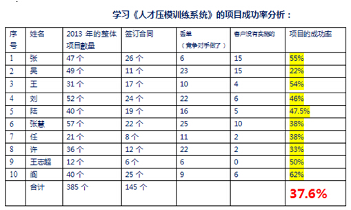 2012年成功率為: 18% ,[2013年相比2012年,項(xiàng)目成功率有了明顯改善110%,效果非常明顯 ] 2、培訓(xùn)后業(yè)務(wù)員學(xué)習(xí)心得及改善建議